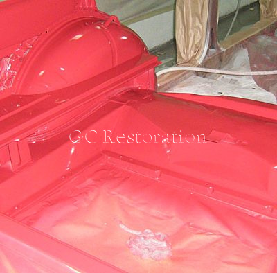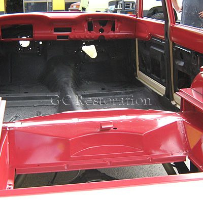 Roof turret unpicked for rust repairs in turret frame and extensive two tone colour combination with all interior panels painted red.